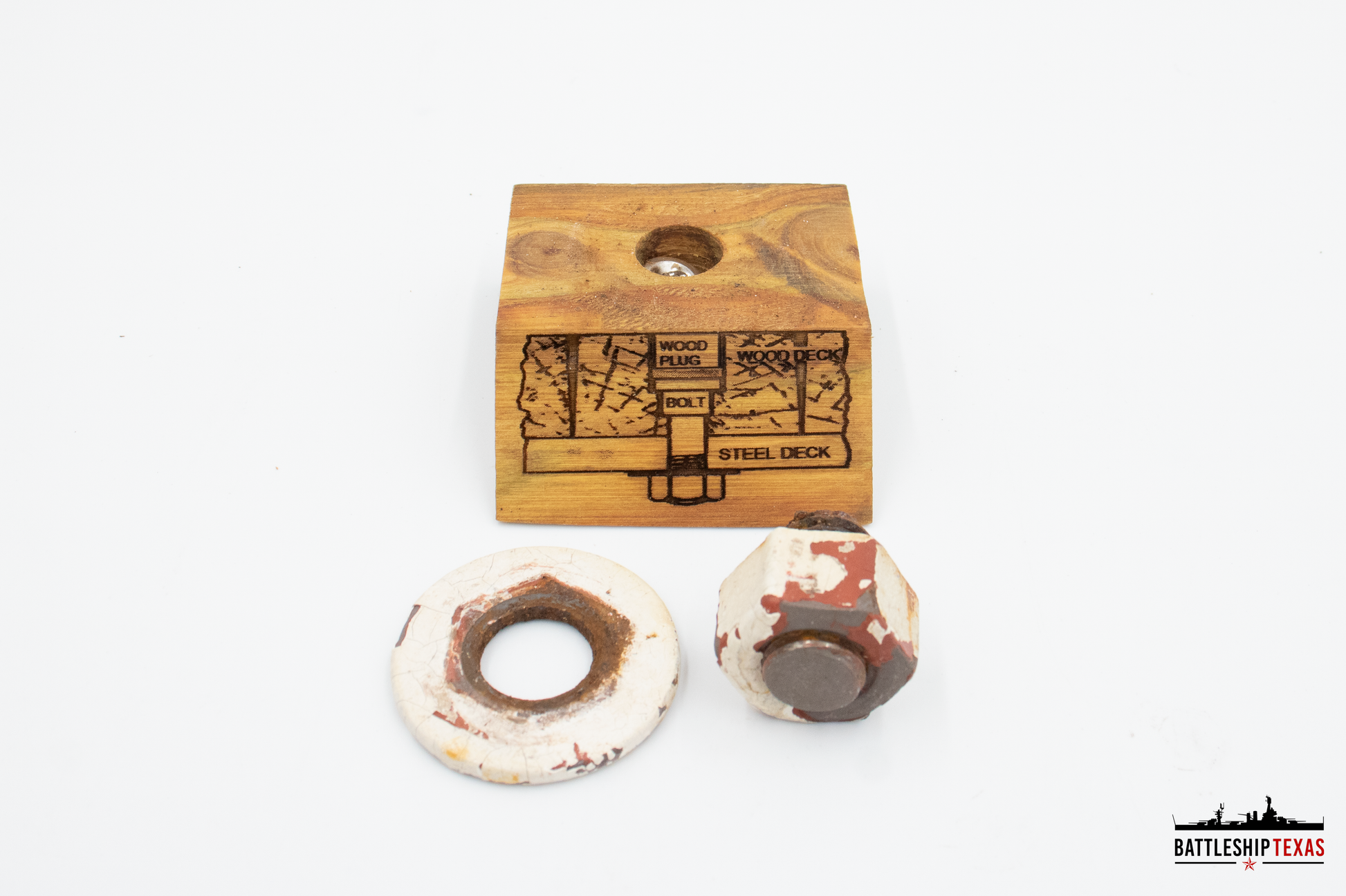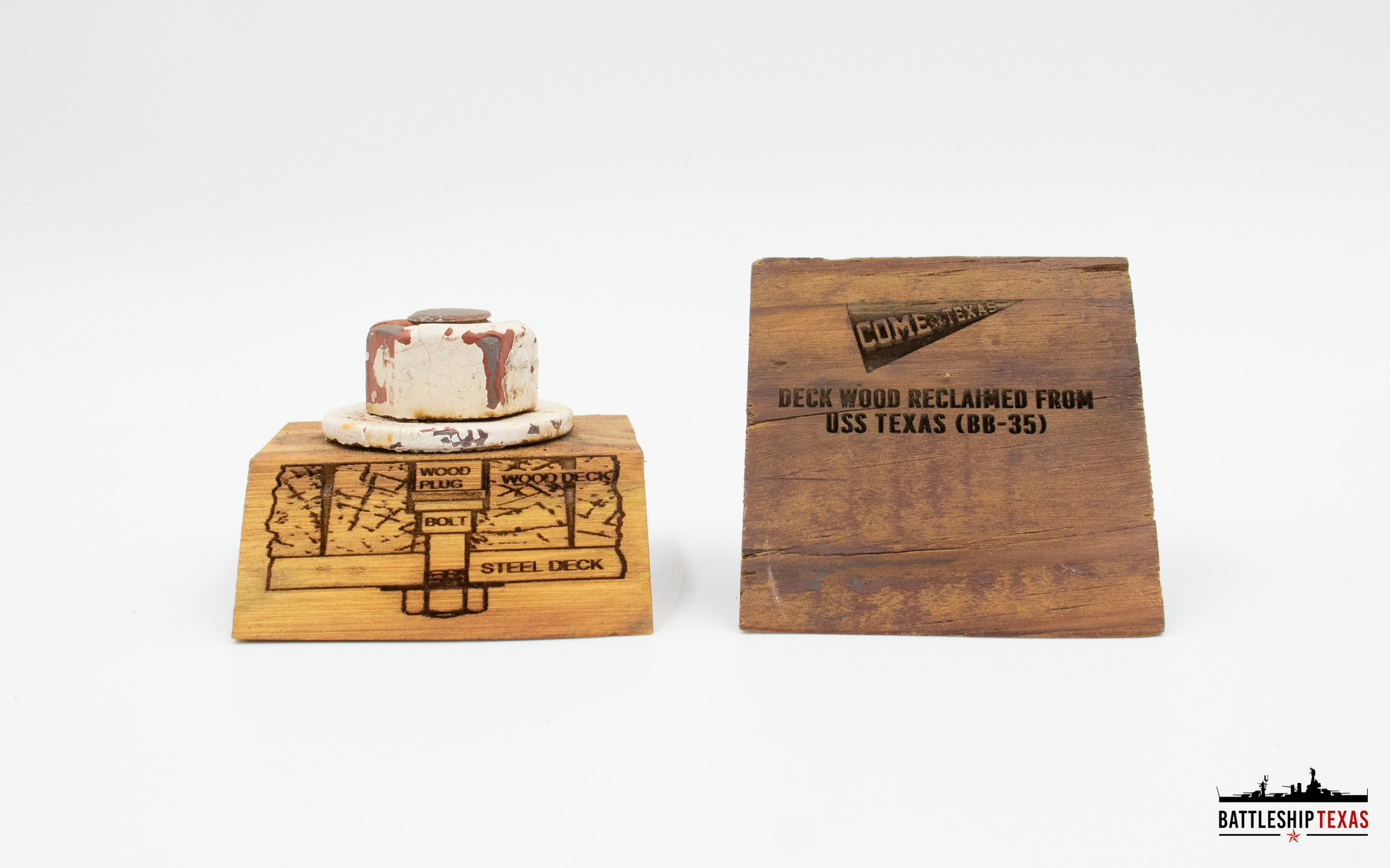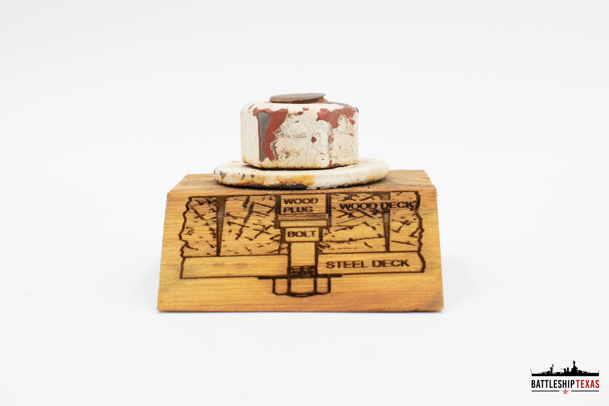 Each Deck Bolt & Stand includes a remaining bolt, nut, and washer removed from the underside of the superstructure deck, placed on a display stand made from the 1990 deck, lasered with a diagram from the General Arrangement of Deck Planking approved for TEXAS on May 3, 1912. An official Certificate of Authenticity will be included with each piece.