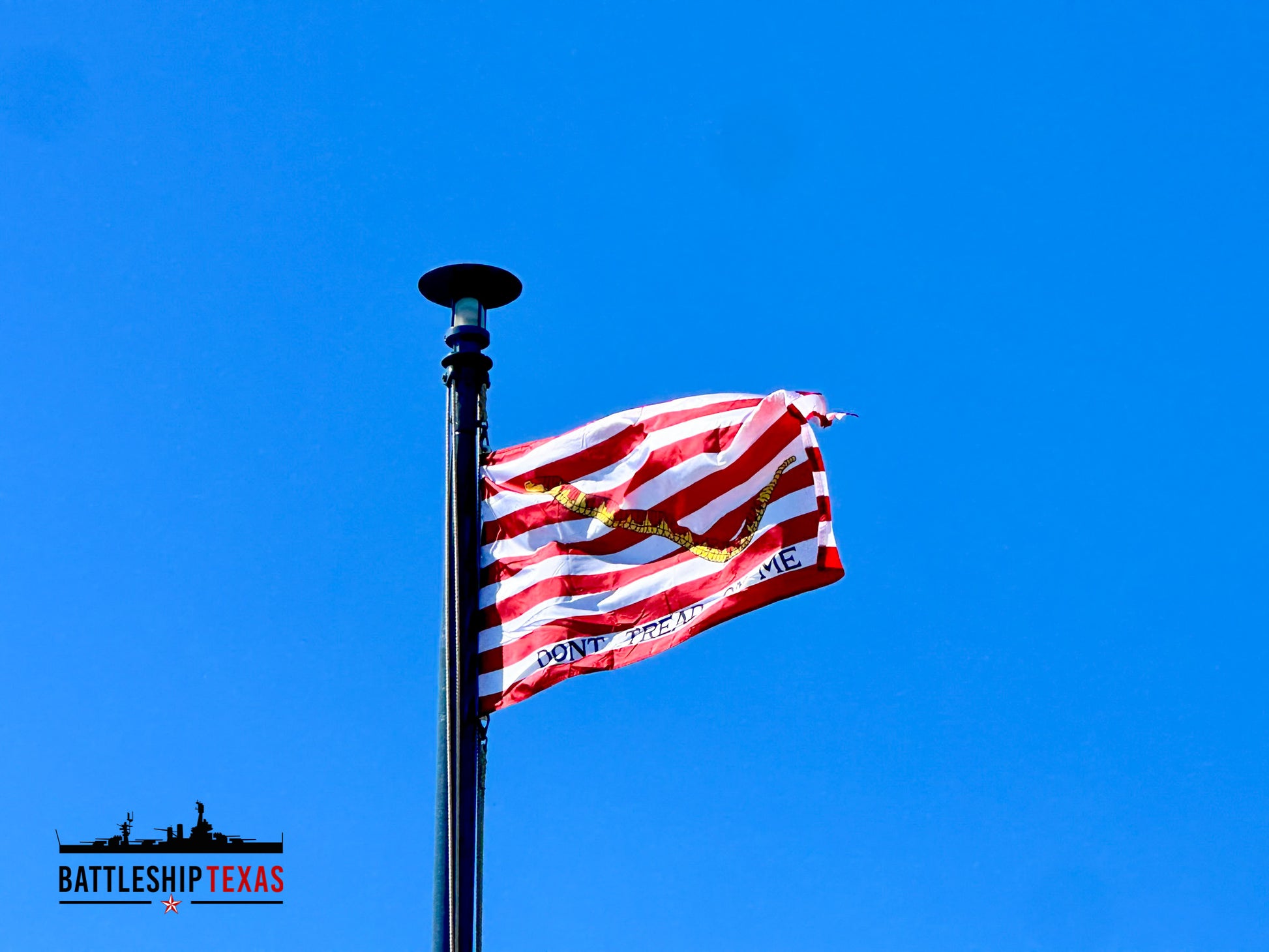 In celebration of the United States Navy’s 250th birthday, Battleship Texas flew the 1st Navy Jack.
